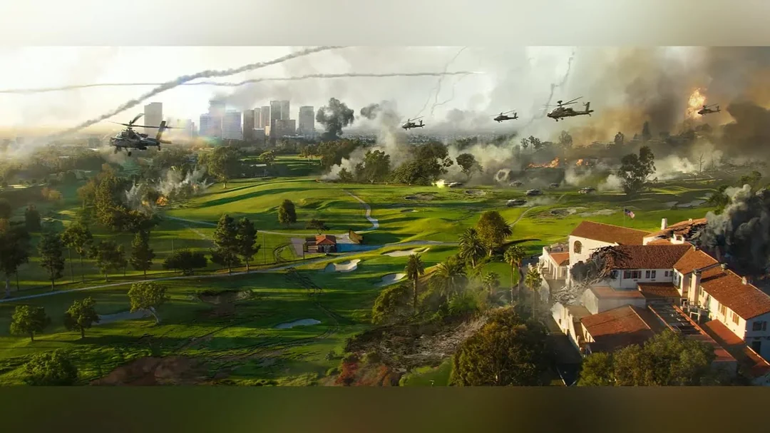 - Los Angeles in Ruins: One image shows a soldier amid the wreckage of Sunset Boulevard, surrounded by burned-out vehicles. Another depicts the iconic street sign in floodwaters, with an attack boat racing past. A golf course, possibly inspired by LA’s Riviera Country Club, features military jets overhead, hinting at thrilling air combat.